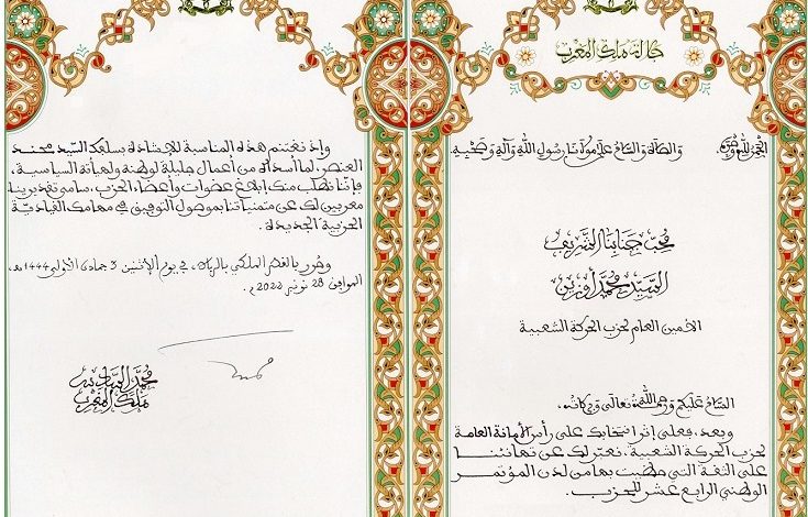 Sa Majesté le Roi a ajouté « tout en saisissant cette occasion pour saluer votre prédécesseur, M. Mohand Laenser, pour les services louables rendus à sa patrie et son instance politique, je vous charge de transmettre ma Haute considération aux membres du parti et vous souhaite plein succès dans vos nouvelles missions partisanes ».